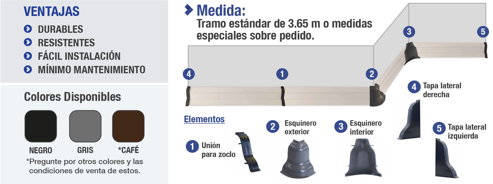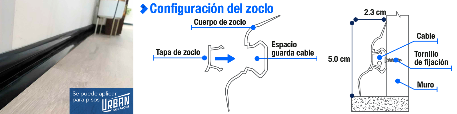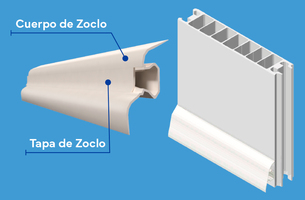 El zoclo es el detalle perfecto estético de la unión entre el piso y el muro, cuenta con los estudios de la más alta tecnología y fue diseñado a las necesidades del uso cotidiano, logrando funcionalidad, estética y alta resistencia con durabilidad, como son: que guía y oculta cables, de muy fácil instalación, cuenta con esquineros, juntas y remates.